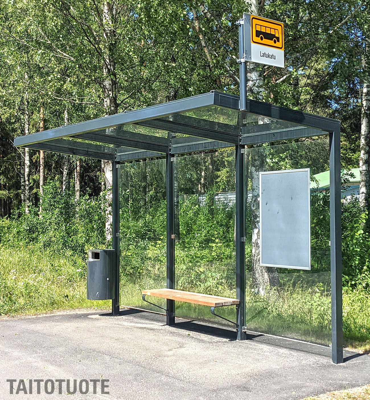 Karkaistut seinälasit, karkaistut ja laminoidut sävylasit katossa, pulverimaalattu teräsrunko.