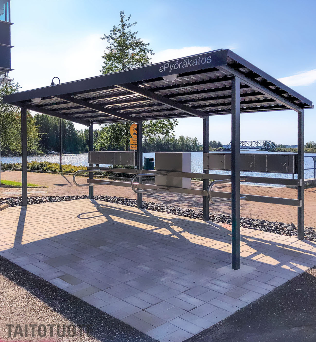 Aurinkopaneelit katolla, lukittavat RST-latauskaapit 6:lle pyörälle, pulverimaalattu teräsrunko.