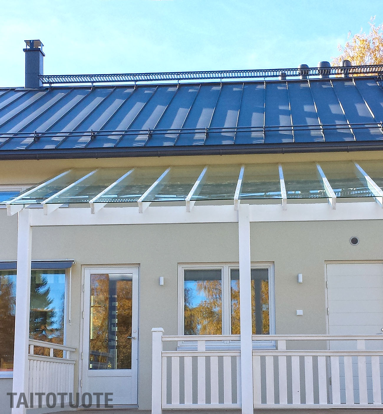 Kirkas karkaistu lasi, valkoiset kattolasituslistat.
