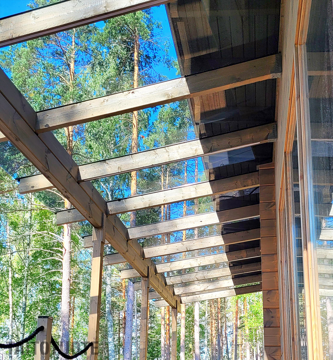 Kirkkaat karkaistut lasit seinissä, karkaistut ja laminoidut lasit katossa, kuumasinkitty teräsrunko suurilla liukuovilla ja saranoidulla käyntiovella.